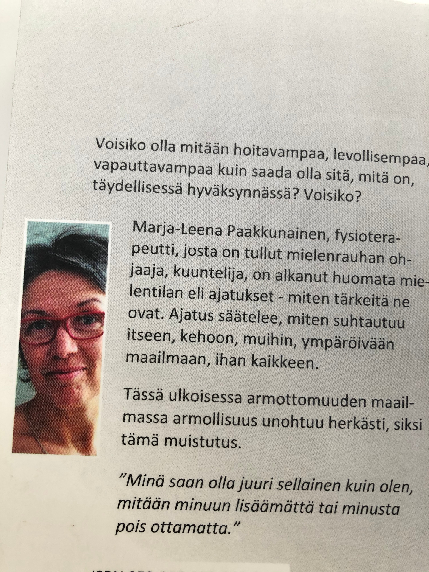 Marja-Leena Paakkunainen, fysioterapeutti, josta on tullut mielenrauhan ohjaaja, kuuntelija, on alkanut huomata mielentilan eli ajatukset - miten merkittäviä ne ovat. Ajatus säätelee, miten suhtautuu itseen, kehoon, muihin, ympäröivään maailmaan, ihan kaikkeen. Tässä ´ulkoisessa´, kovin armottomaltakin näyttäytyvässä maailmassa armollisuus peittyy ja unohtuu herkästi, siksi tämä muistutus.